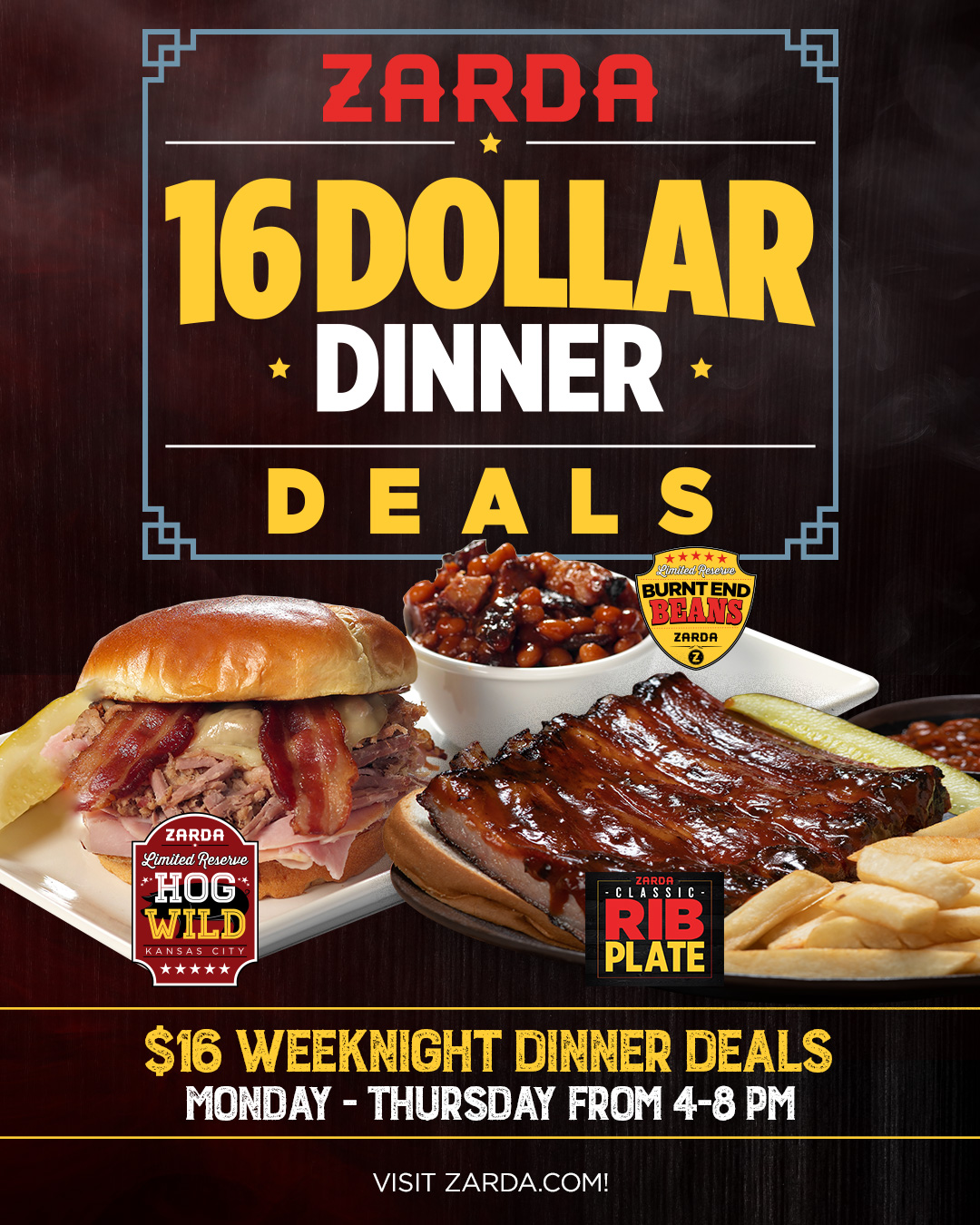 Zarda’s $16 Dinner Deal is available Monday through Thursday from 4-8 pm for dine-in, carry out, curbside, drive-thru, and online ordering at both Zarda locations in Blue Springs and Lenexa.
